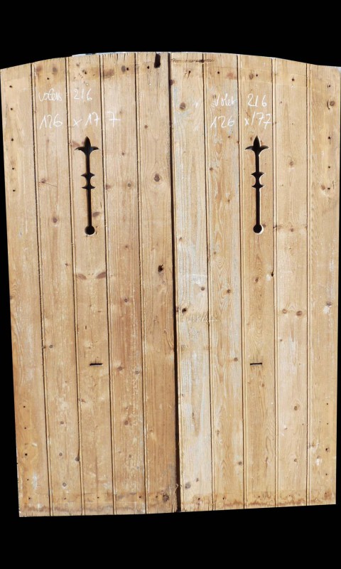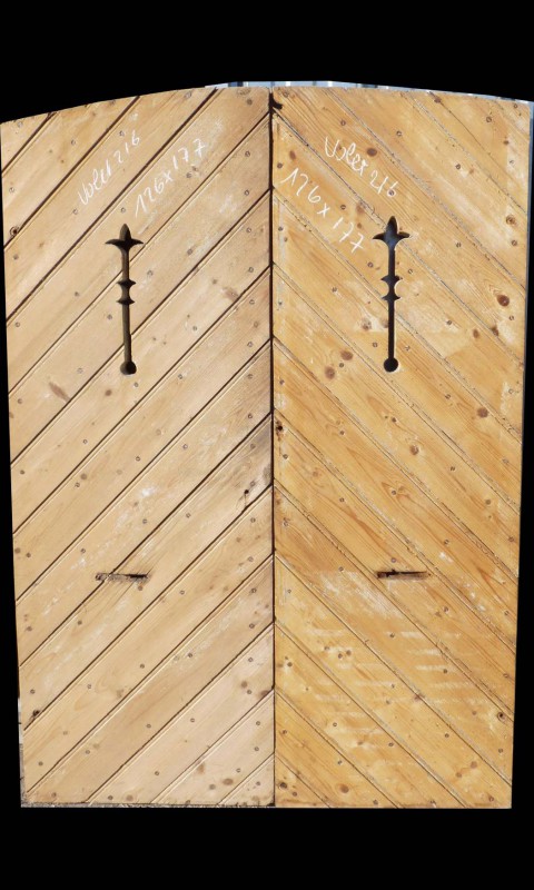 Paire de volets à planches croisées avec décor style savoie, cintré en haut.