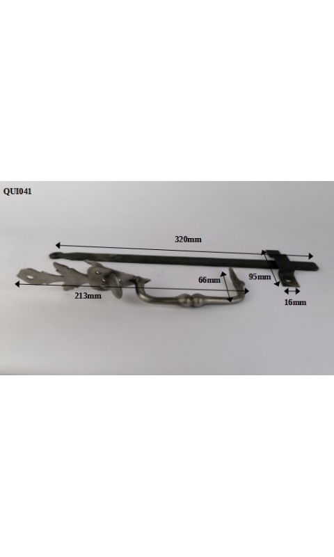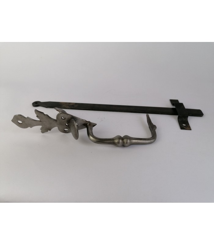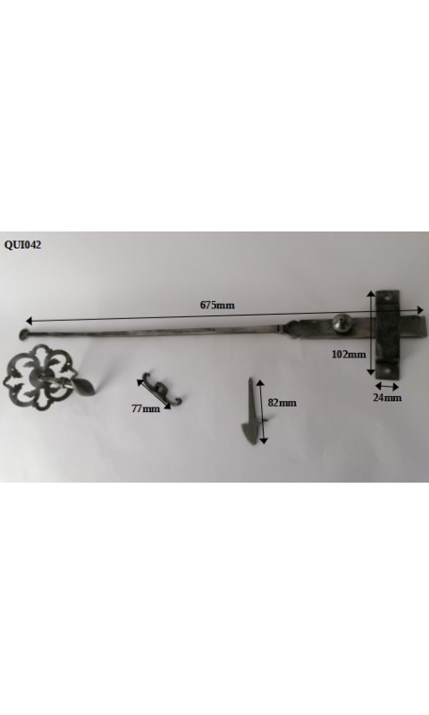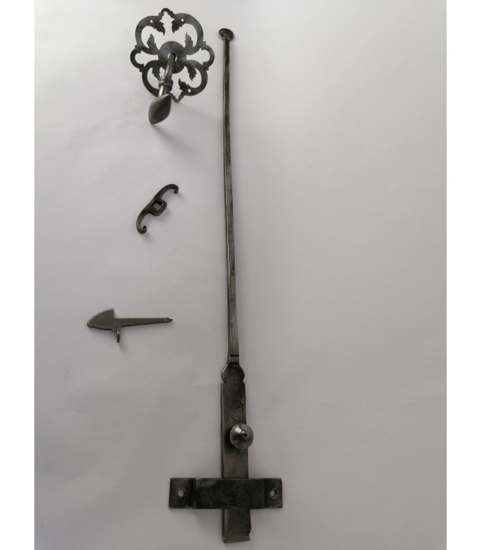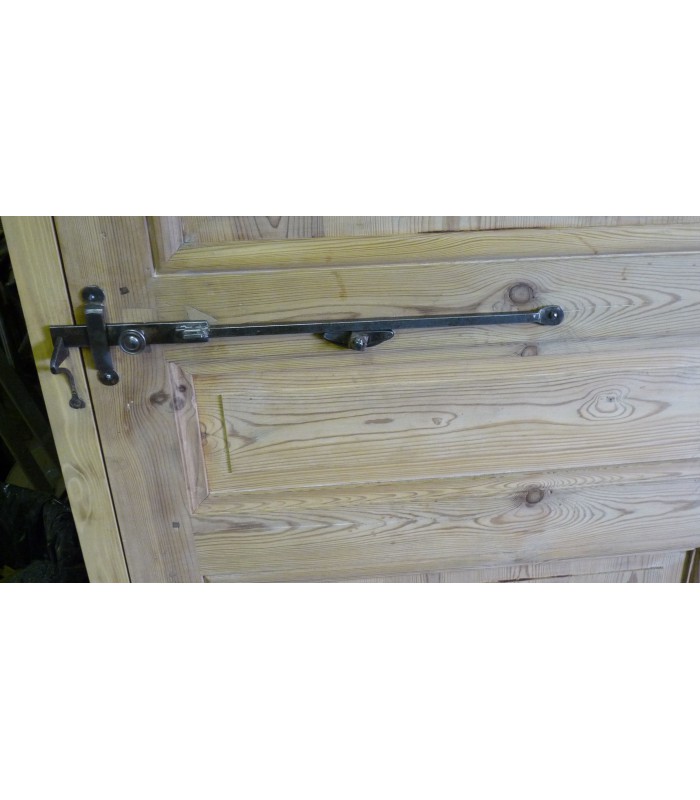 La première se compose de trois grandes pièces de quincaillerie. La clenche correspond à la longue barre métallique mobile. Le mentonnet retient la clenche et la porte fermée tandis que le poucier et un mécanisme permettant d’actionner le tout.